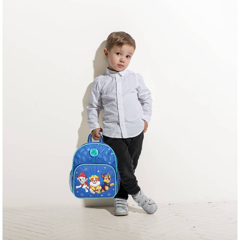 Acest ghiozdan Paw Patrol din colecția Pups in the go de culoare albastră cu accente verzi și bleu îi are pe buzunarul din față pe Chase, Rubble și Marshall alergând spre copilul dumneavoastră și protejându-i lucrurile pe care la cară cu el. Compartimentul principal este destul de spațios pentru obiectele mari cum ar fi cutia de prânz pentru școală sau haine de schimb pentru gradiniță. Obiectele mici pot fi puse în buzunarul mic de pe fața, iar bretelele ajustabile fac ghiozdanul comod la purtarea pe umeri. Rucsacul are un compartiment principal + un compartiment secundar în partea din față, cu închidere pe bază de fermoar, plus două buzunare tip plasă in lateral. Material rezistent, cu spate moale, buretat, pentru confort în timpul utilizării. Bretelele sunt buretate și pot fi ajustate în funcție de necesitate Prevăzut și cu o gaică pentru a putea fi agățat în cuier.
