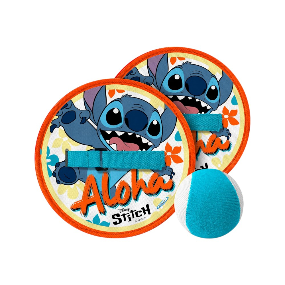 Setul de joc Catch Ball inspirat de îndrăgitul Stitch este potrivit pentru activități distractive și dezvoltarea coordonării mână–ochi. Jocul include 2 palete cu diametrul de 19 cm, dotate cu curele reglabile pentru o fixare confortabilă pe mână, și o minge de 6 cm creată din material moale.
